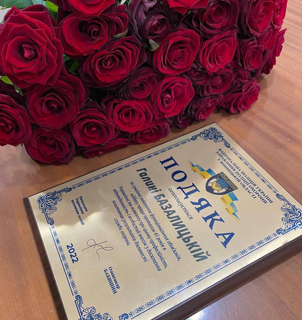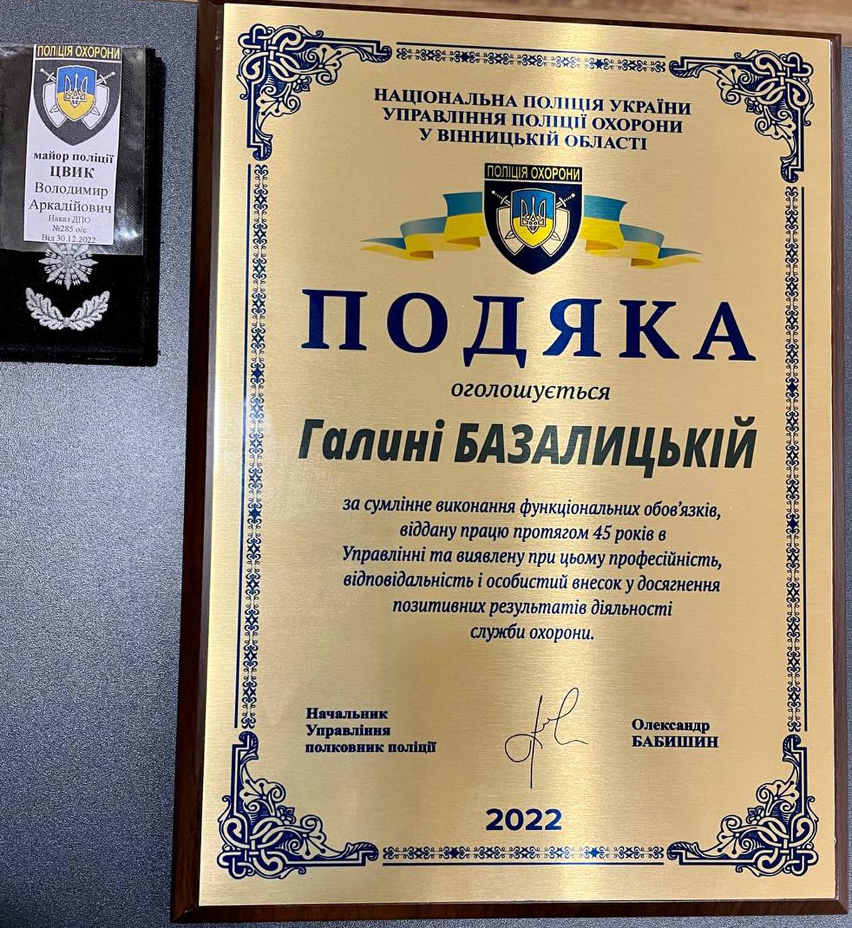Почалась нарада з відзначення співробітників, які віддані своїй роботі та професії. Володимиру Цвику, старшому інженеру технічної охорони Хмільницького РВ - присвоїли чергове спеціальне звання “майор поліції”, а Галину Базалицьку, інженера сектору супроводження договорів - привітали з поважною датою, адже вже 45 років вона працює в Управлінні, роблячи помітний вклад у розвиток нашої служби.