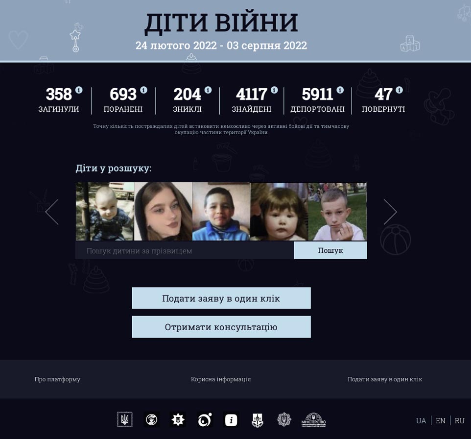 Це інформаційна платформа, що допомагатиме батькам та правоохоронним органам збирати інформацію про дітей, які постраждали під час війни, зокрема зникли безвісти або були незаконно депортовані до росії.