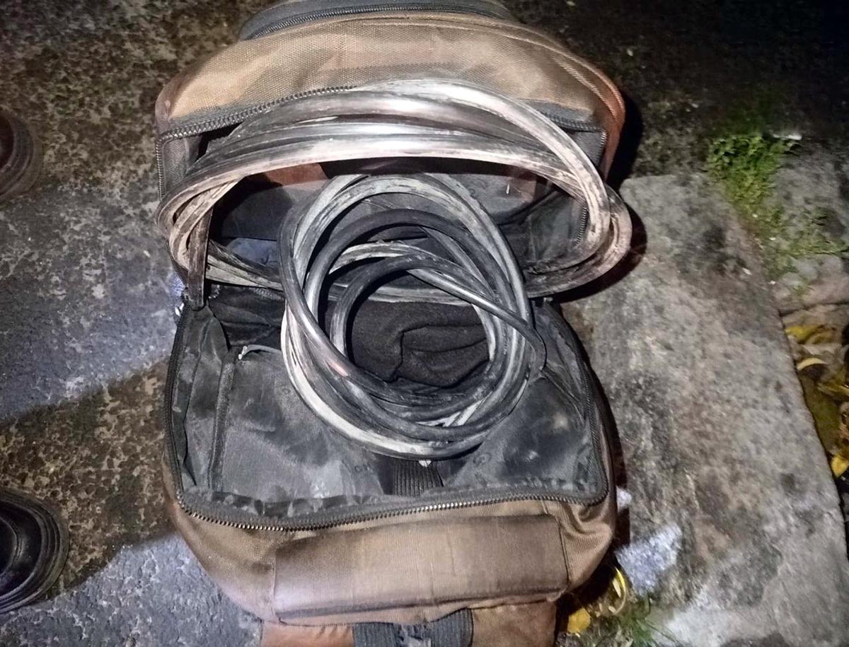 У затриманих правоохоронці вилучили портфель із приблизно п’ятьма метрами змотаного кабелю. На прилеглій території інспектори також знайшли ще два мотки кабелю, приховані під листям.