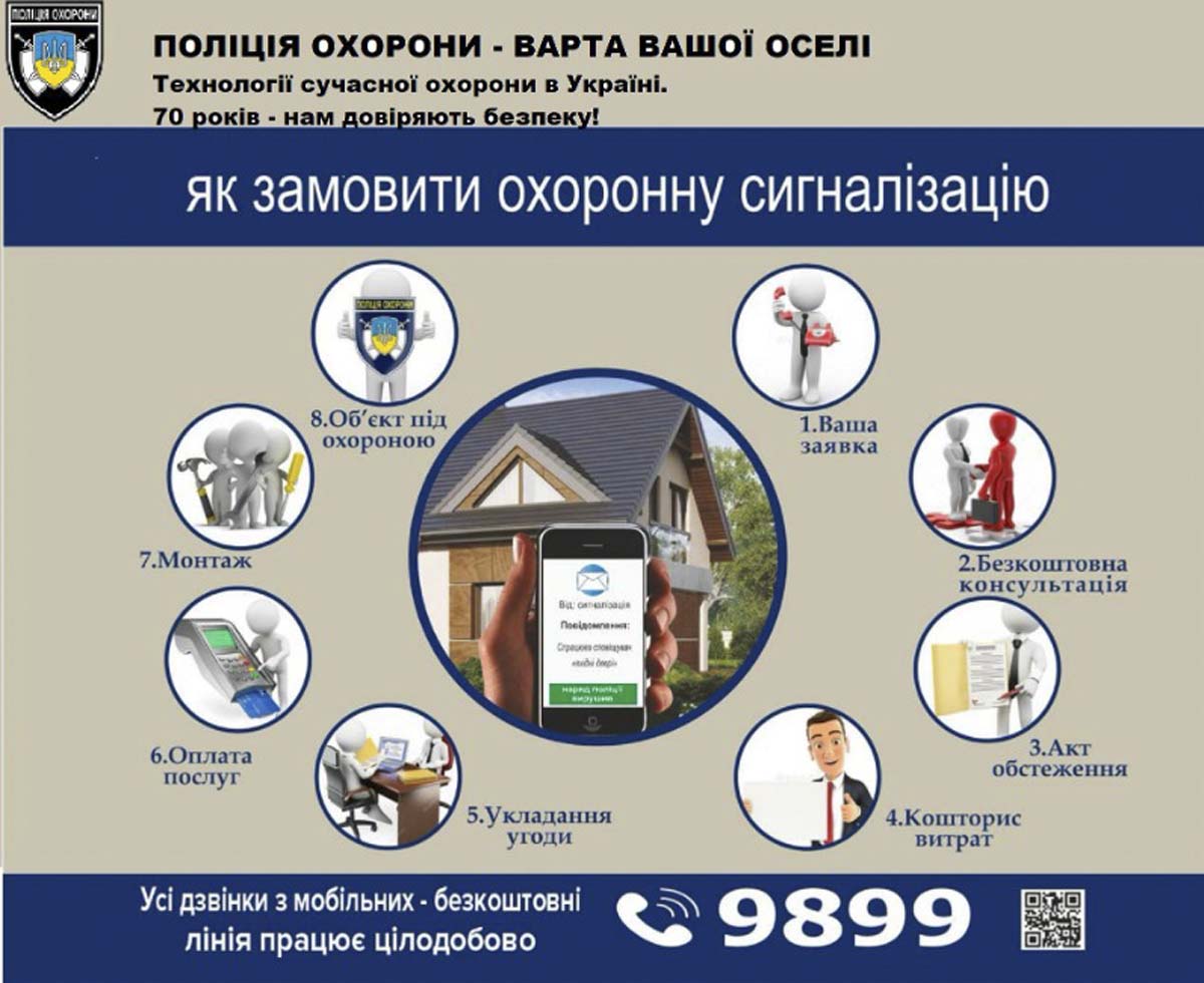 Тож якщо ваша оселя досі незахищена – зателефонуйте з мобільного на безкоштовний номер 9899 і замовте професійну охорону. Фахівці детально вивчать особливості вашого помешкання , врахують усі ваші побажання і встановлять оптимальну за кількістю і видами датчиків охоронну систему.