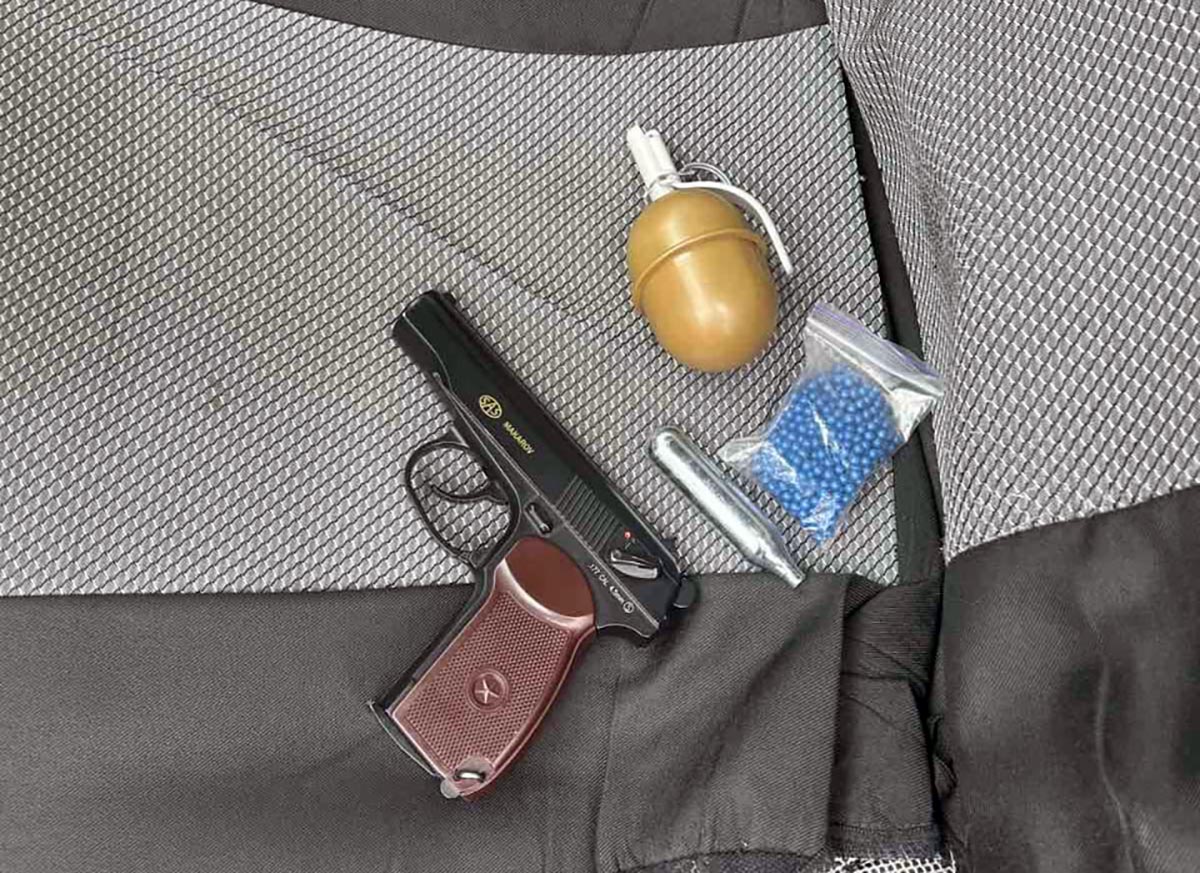 У ході подальшої перевірки встановлено, що предметами, якими громадянин погрожував перехожим, виявилися пневматичний пістолет ПМ №377 СН калібру 4,5 мм та страйкбольна граната.