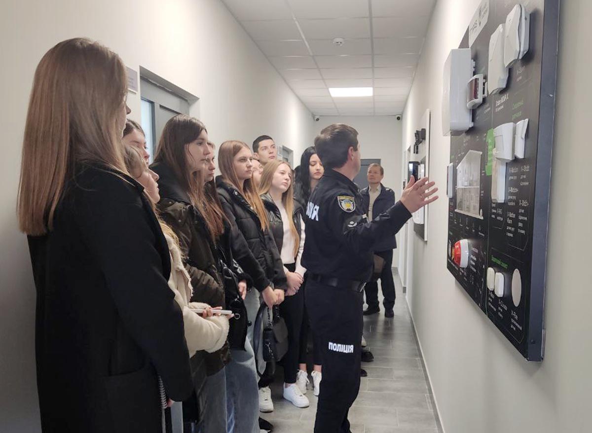 На початку екскурсії студенти побували в черговій частині. Там вони дізналися, як саме передаються тривожні сповіщення групам затримання та як швидко поліцейські прибувають у разі спрацювання сигналізації на об’єкті.