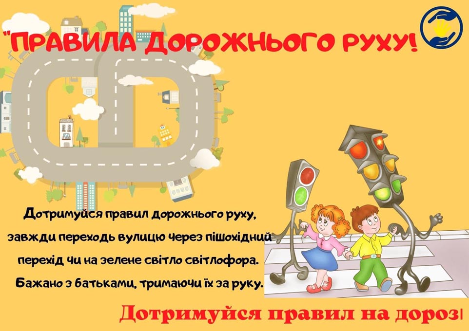 Дотримуйся правил дорожнього руху, завжди переходь вулицю через пішохідний перехід чи на зелене світло світлофора. Бажано з батьками, тримаючи їх за руку. Дотримуйся правил на дорозі.