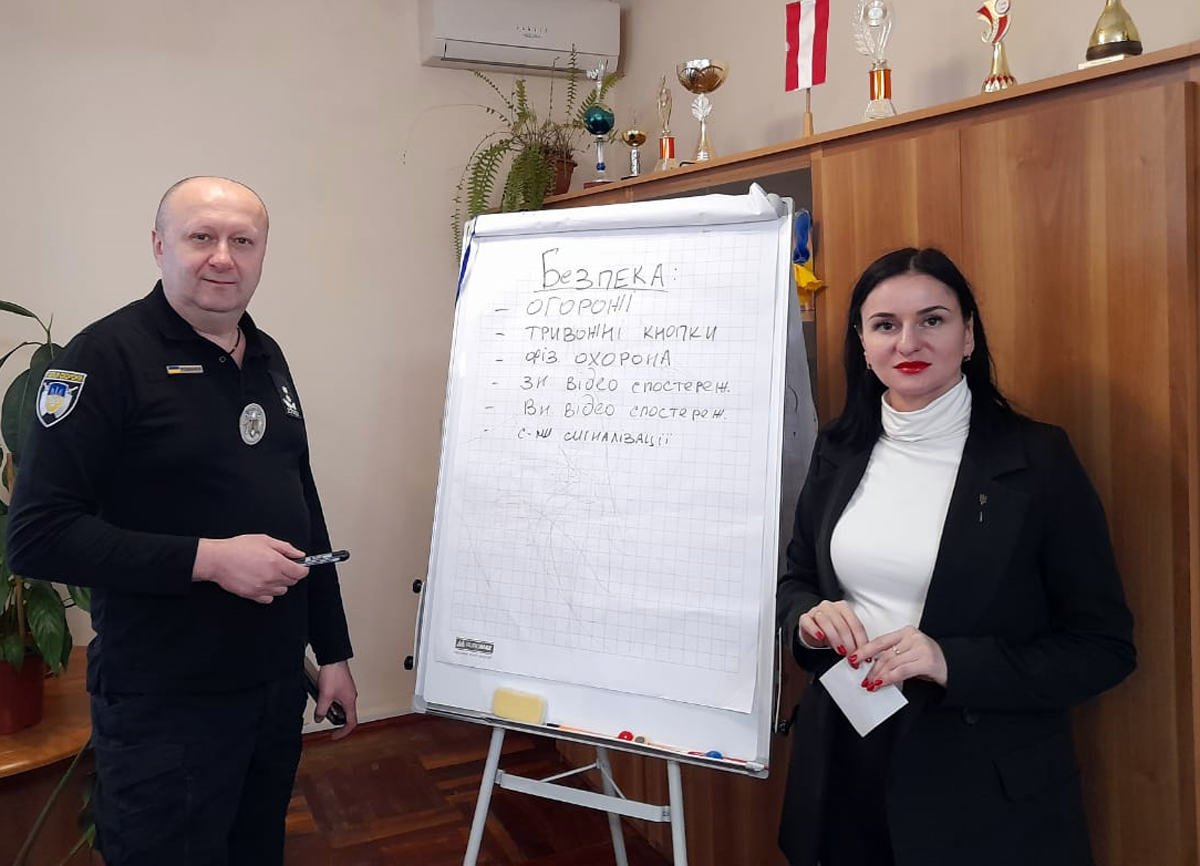 Ірина Ткачук розповіла Михайлу Романюку про те, що має бути зроблено у закладах освіти. А це огорожі, тривожні кнопки, фізична охорона, зовнішнє та внутрішнє відеоспостереження, системи сигналізації.