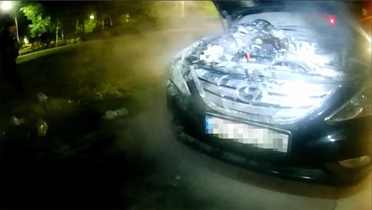 Наряд поліції охорони при патрулюванні вулиць міста помітив на узбіччі дороги автівку марки «Хюндай», яка почала палати. Поліцейські охорони зреагували миттєво та прийняли рішення допомогти водію у надзвичайній події та за допомогою свого вогнегасника загасили полум’я.