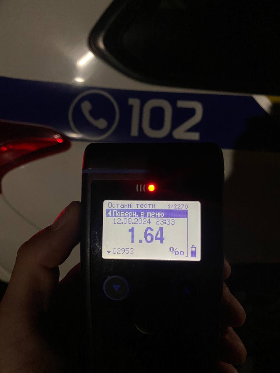 На місце події було викликано наряд патрульної поліції. Працівники запропонували правопорушнику пройти огляд на стан сп’яніння на місці зупинки за допомогою спеціального технічного приладу Drager. Відповідна перевірка підтвердила підозри поліцейських – 1,64 проміле алкоголю у крові.