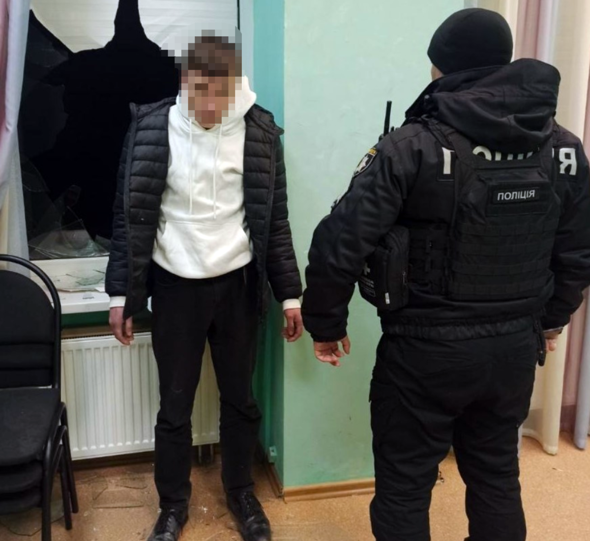 Під час обстеження будівлі було виявлено в розбите скло вікна на першому поверсі та молодика, який шляхом розбиття скла вікна проник до охороняємого об'єкта.