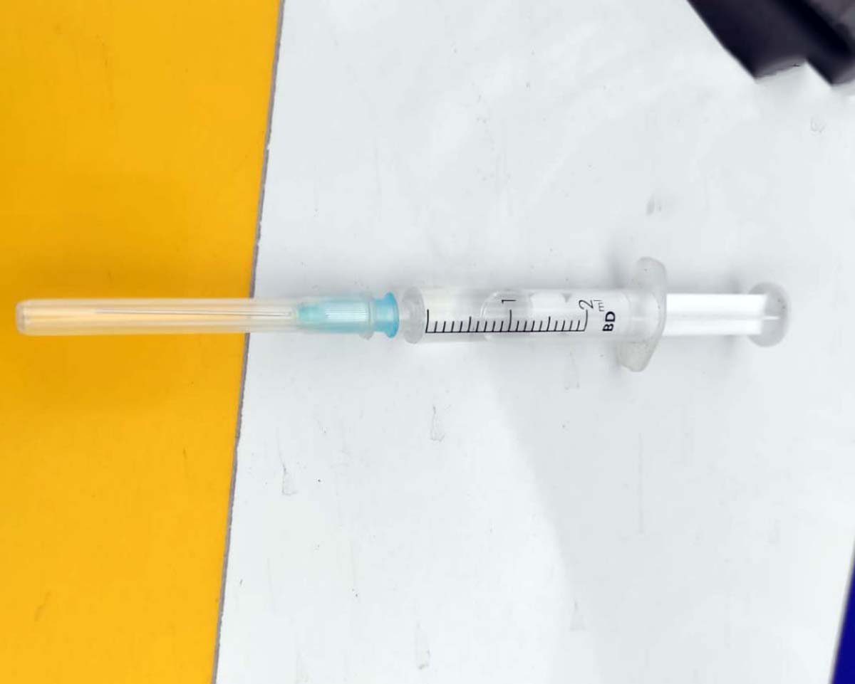 При поверхневому огляді у громадянина було було виявлено шприц 2 мл. з речовиною прозорого кольору, схожу на наркотичну.