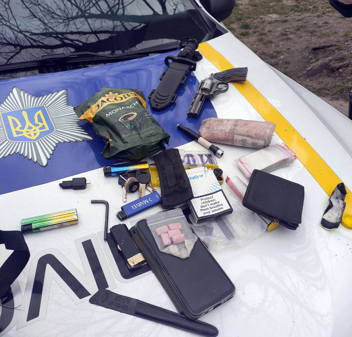 Під час патрулювання співробітники поліції охорони об 11 ранку зупинили чоловіка, який побачивши правоохоронців одразу змінив маршрут. Під час поверхневого огляду затриманий дістав з кишені згорток з речовиною рослинного походження зеленого кольору, наголосивши, що наркотичну речовину тримає для власного вжитку. У кишенях у 40-річного місцевого мешканця також були револьвер та ніж, які, як стверджує чоловік, потрібні йому для власного самозахисту.