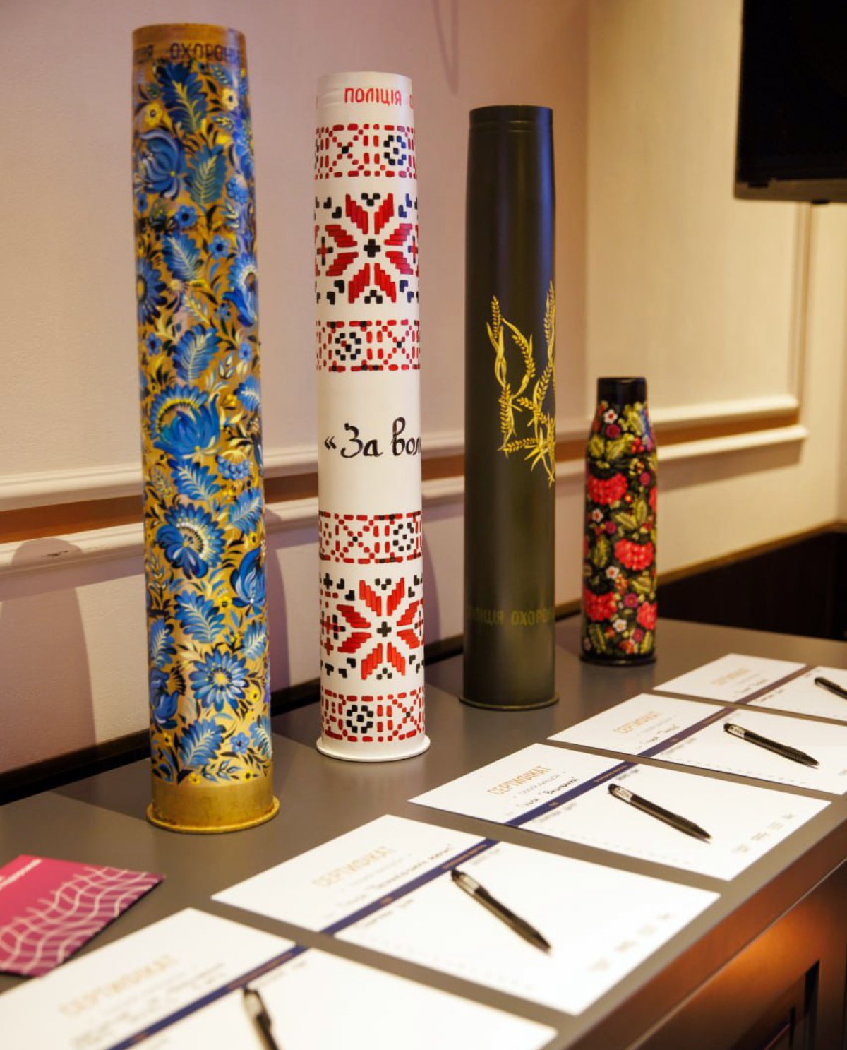 Для аукціону поліція охорони Одещини розробила та передала організаторам чотири гільзи від захисників із найзапекліших територій активних бойових дій. Розписувала гільзи одеська художниця Анна Вербич. Дуже вдячні мисткині за чудову роботу з патріотичними наративами!