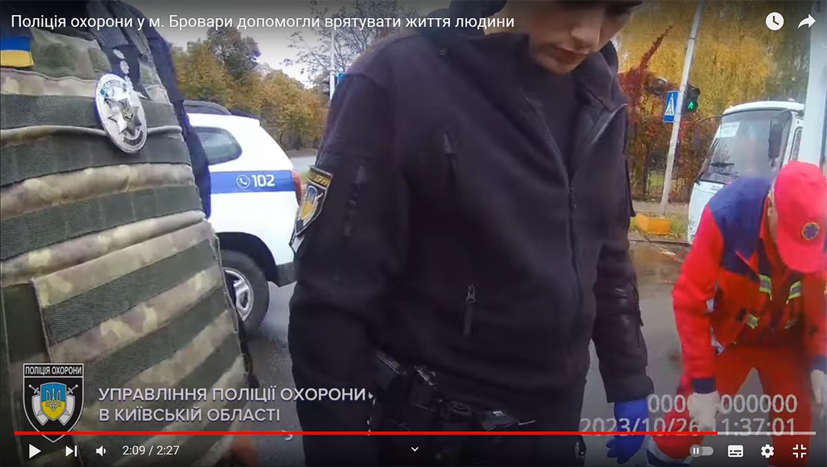 Молодший інспектор взводу реагування Броварського підрозділу поліції охорони Владислав Савченко підбіг оглянути чоловіка. Інший співробітник поліції охорони негайно викликав швидку та огородив територію.
