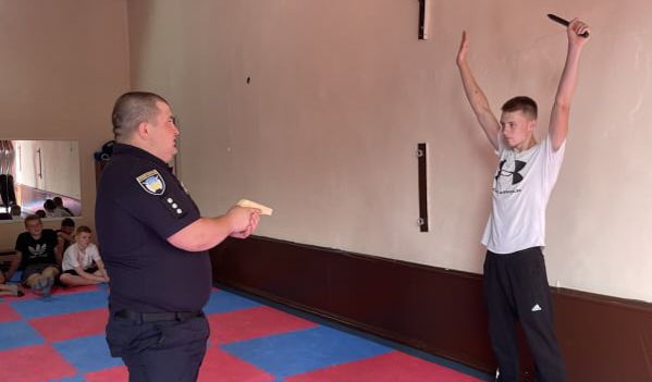 Також на хлопців чекало заняття з рукопашного бою. Під керівництвом досвідченого наставника підлітки відпрацювали прийоми самозахисту при раптовому нападі правопорушника у транспорті, громадському місці, а також при великому скупченні людей.