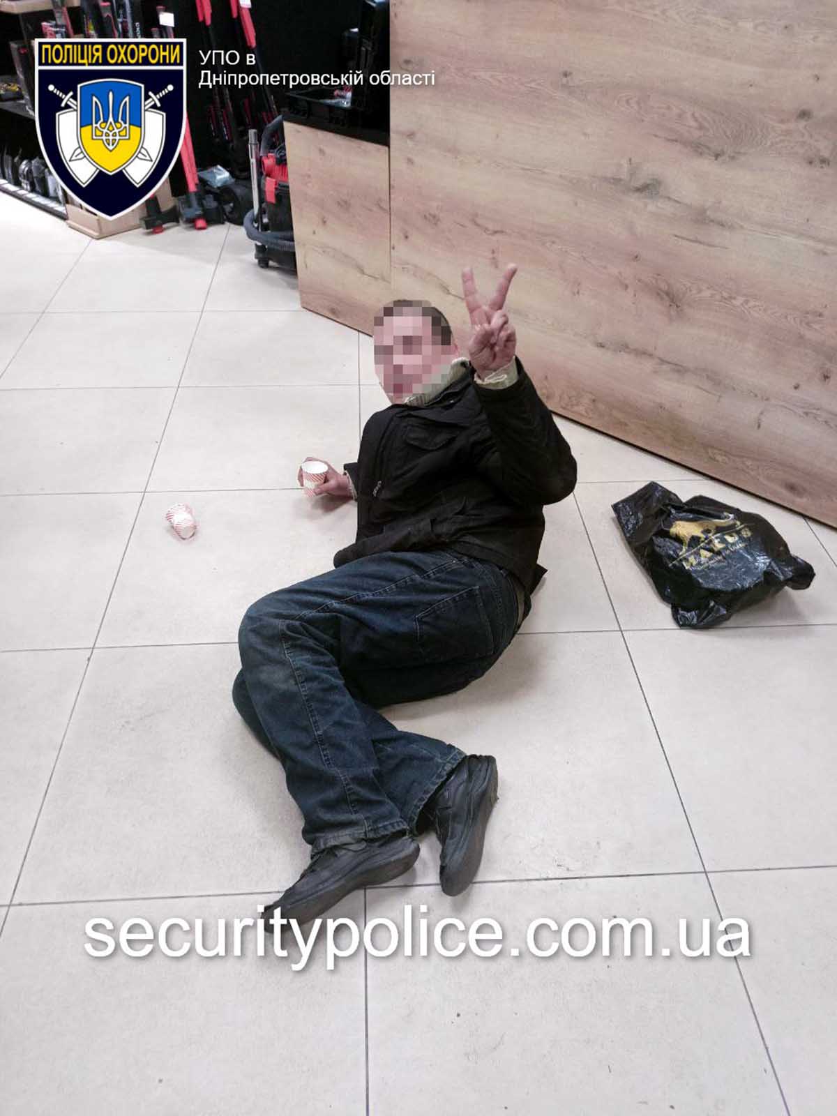 Прибувши на місце пригоди поліцейські охорони виявили розбите скло вхідних дверей магазину та чоловіка, який розмістився всередині приміщення на підлозі з кавою в руці.