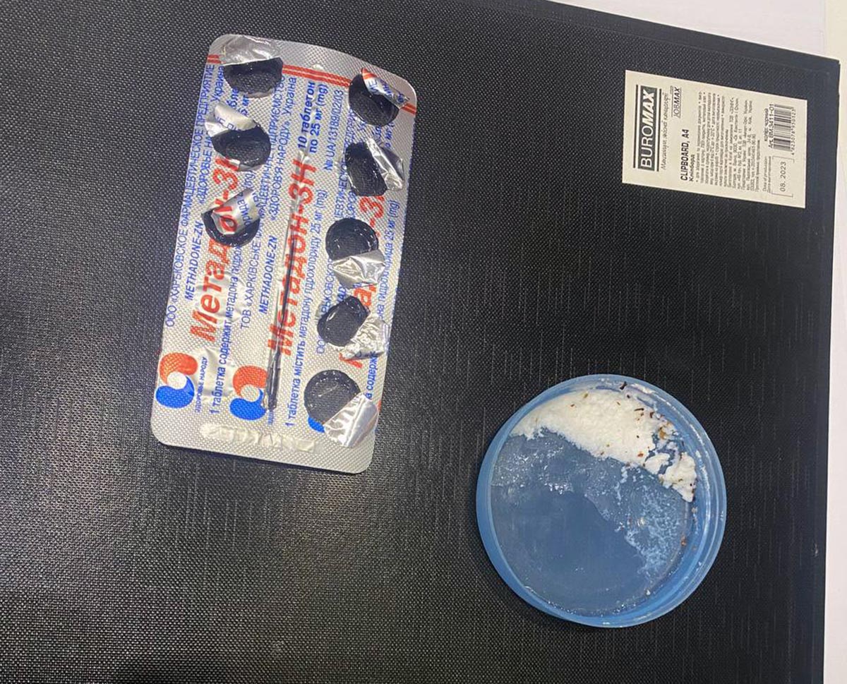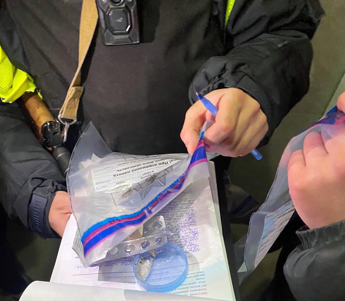 У чоловіка виявили блістер з таблетками та порошкоподібну речовину, ймовірно наркотичну, наявність якої він пояснити не зміг.