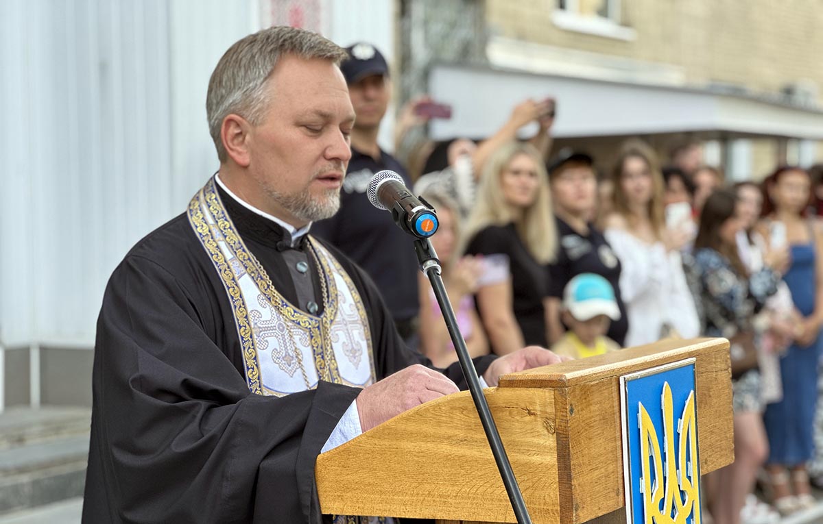 Серед почесних гостей випуску був і настоятель храму Святителя Миколая отець В’ячеслав, який також привітав слухачів, благословив на легку службу та освятив священною водою.