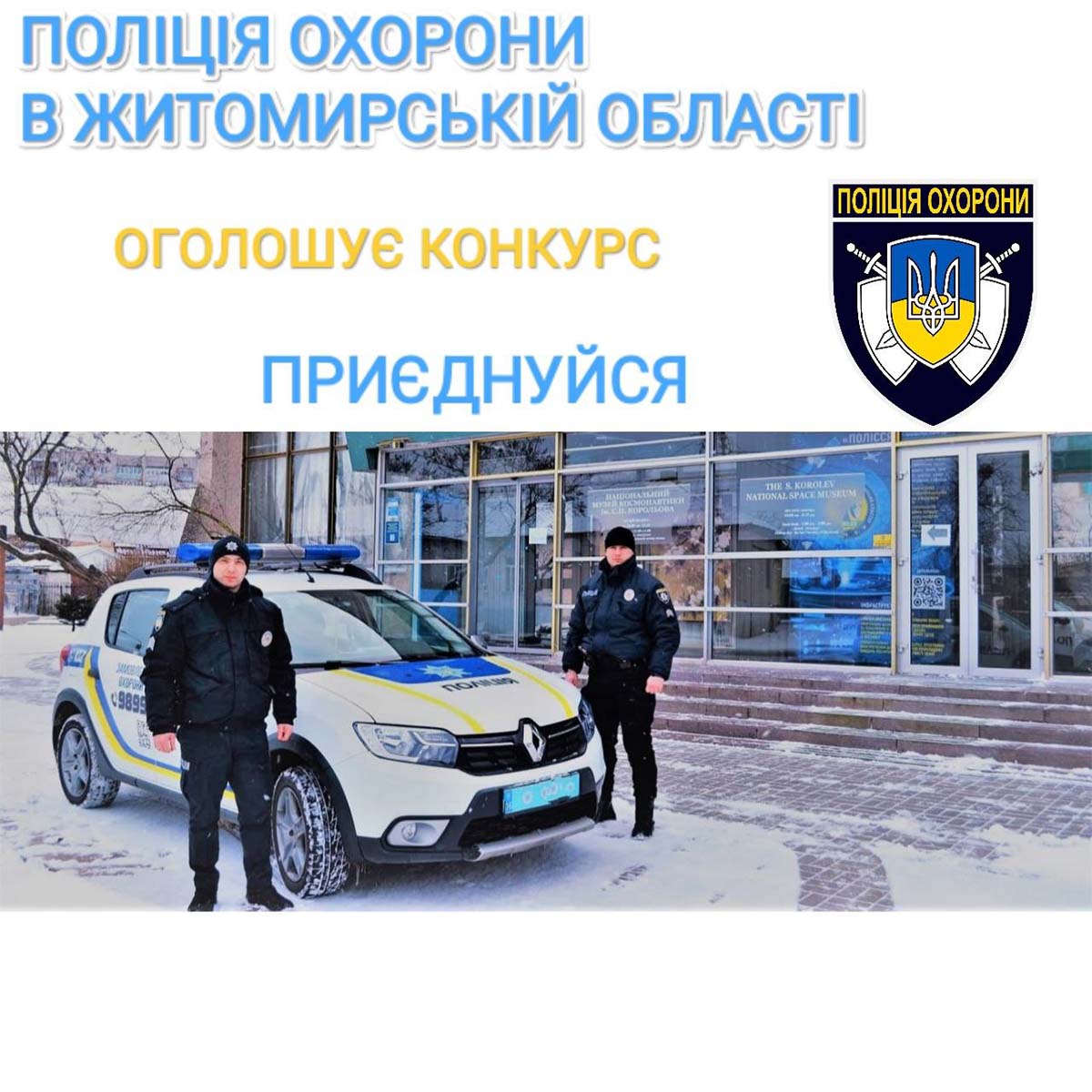 З 10 лютого 2023 Управління поліції охорони в Житомирській області оголошує конкурс на заміщення 2 вакантних посад поліцейських молодшого складу у містах Житомир та Малин.