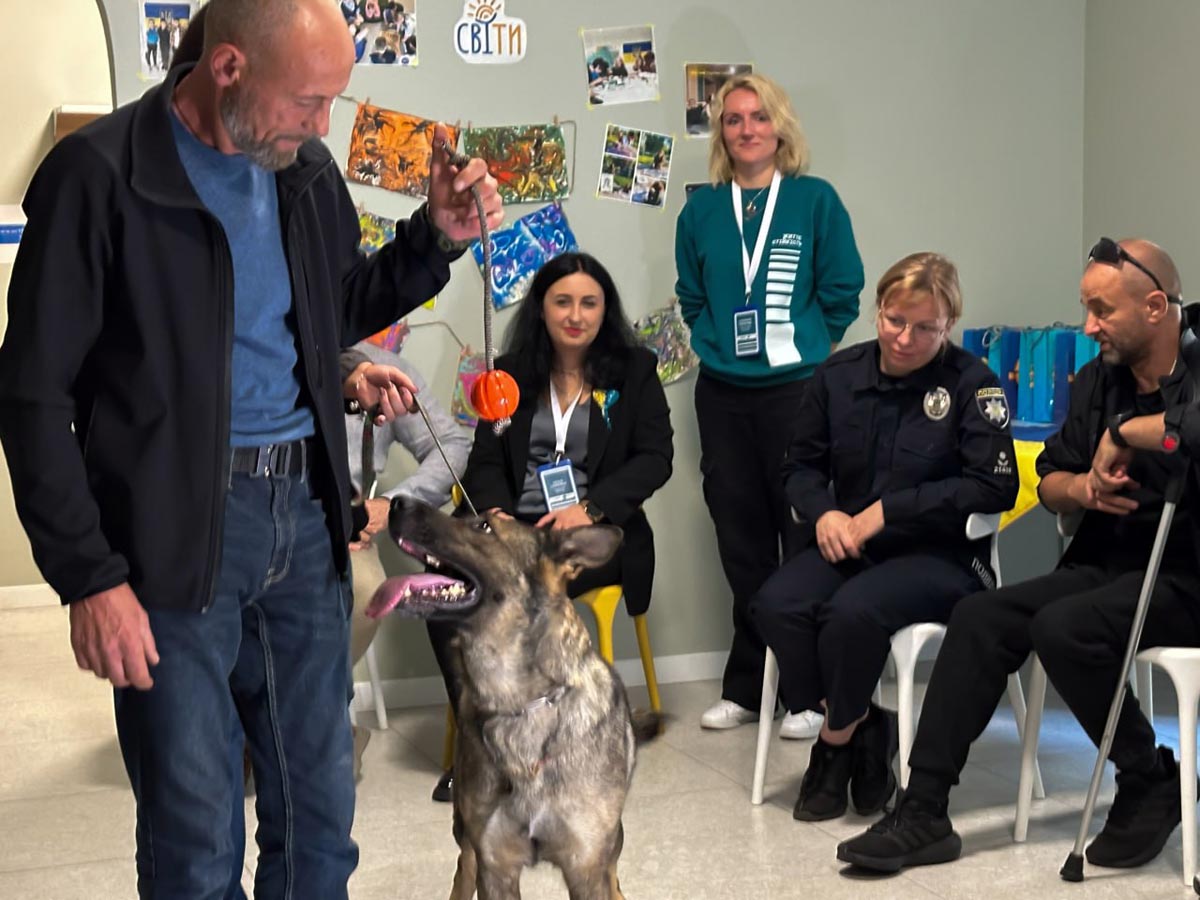 Під час заняття учасники виконували вправи зі спеціально підготовленими собаками під керівництвом кінологині Житомирської Академії поліції Катерини Стрілець. Допомагала у роботі також психологиня Центру життєстійкості Катерина. Програма включала рухливі ігри з м’ячем, відпрацювання команд та вправу на довіру — пройти між стільцями із заплющеними очима, тримаючи собаку на повідку. Такі взаємодії сприяють зниженню рівня стресу, покращують емоційний стан і створюють атмосферу довіри та взаємної підтримки.