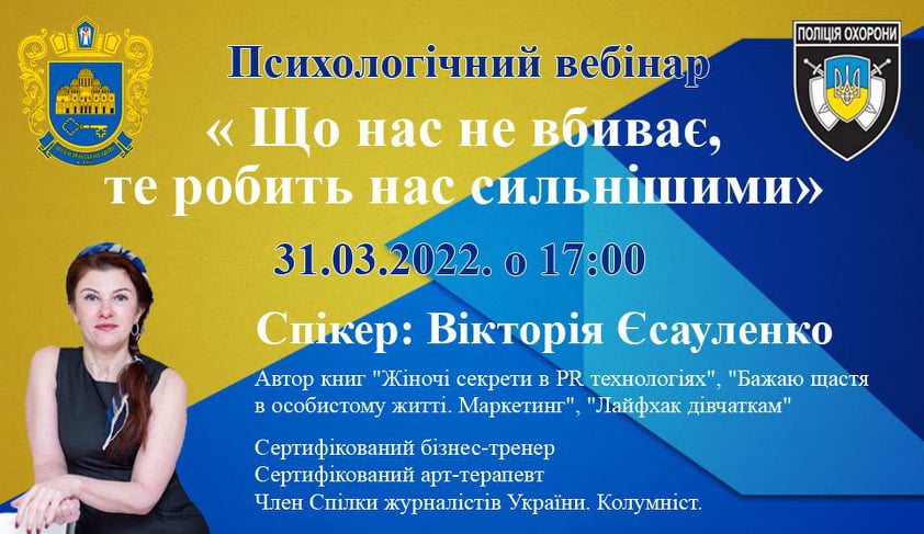 31 березня 2022 року о 17:00 за спільної ініціативи Департаменту поліції охорони та Шевченківської райдержадміністрації відбудеться онлайн-зустріч: «Що нас не вбиває, те робить нас сильнішими». Війна змінює...
