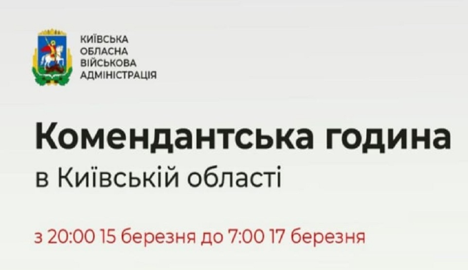Комендантська година у всіх районах Київської області діятиме з 20:00 15 березня до 7:00 17 березня. Під час комендантської години забороняється пересування населеними пунктами транспортом та пішки без...