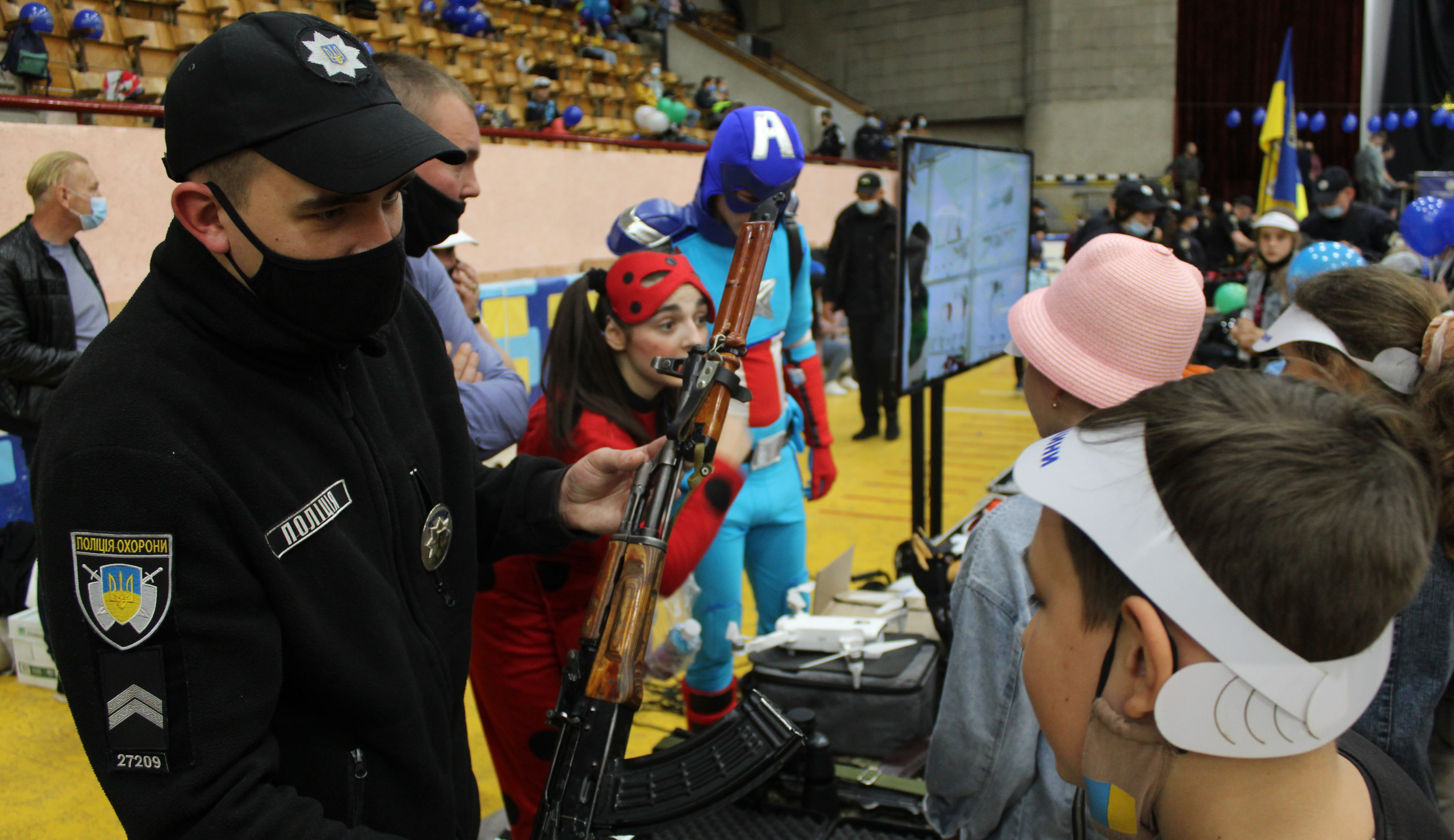 І дорослі, і малі вишикувались у чергу, щоб посидіти за кермом службової автівки поліції охорони, приміряти бронежилет, потримати у руках зброю, здійснити обшук за допомогою металошукача. Діти залюбки, виконували жартівливі службові завдання, приймали участь у невеличких конкурсах і отримували подарунки – значки, прапорці, кульки, календарики.