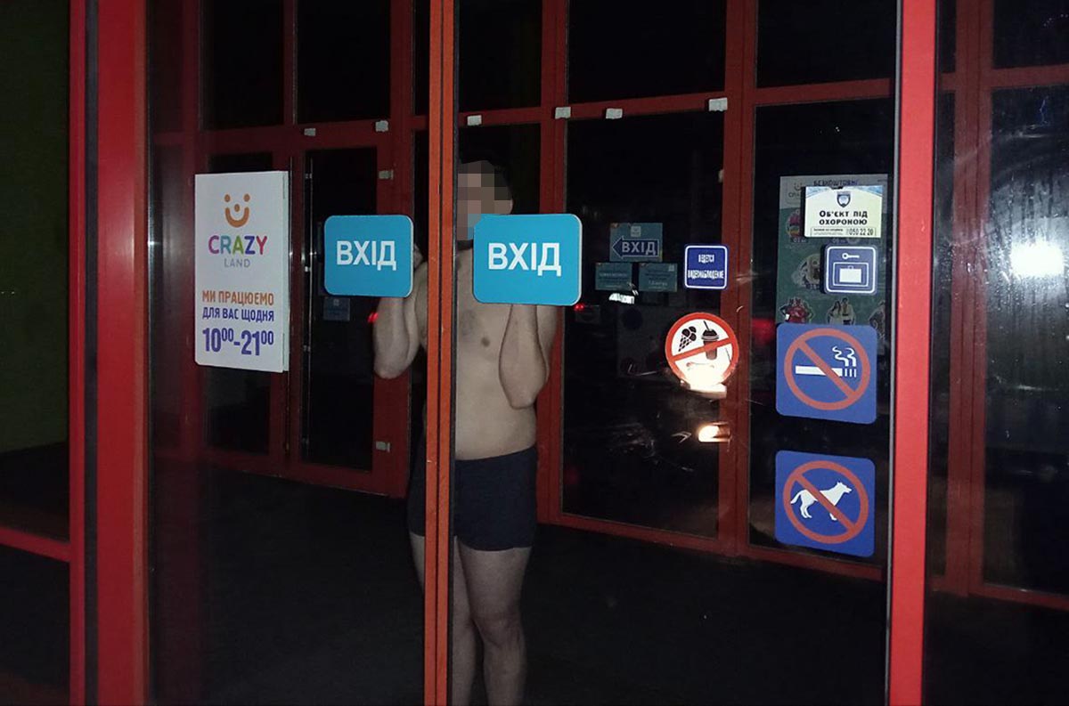 При прибутті на місце події поліцейськими охорони виявлено невідомого, напівоголеного чоловіка у вітрині дитячого розважального центру.