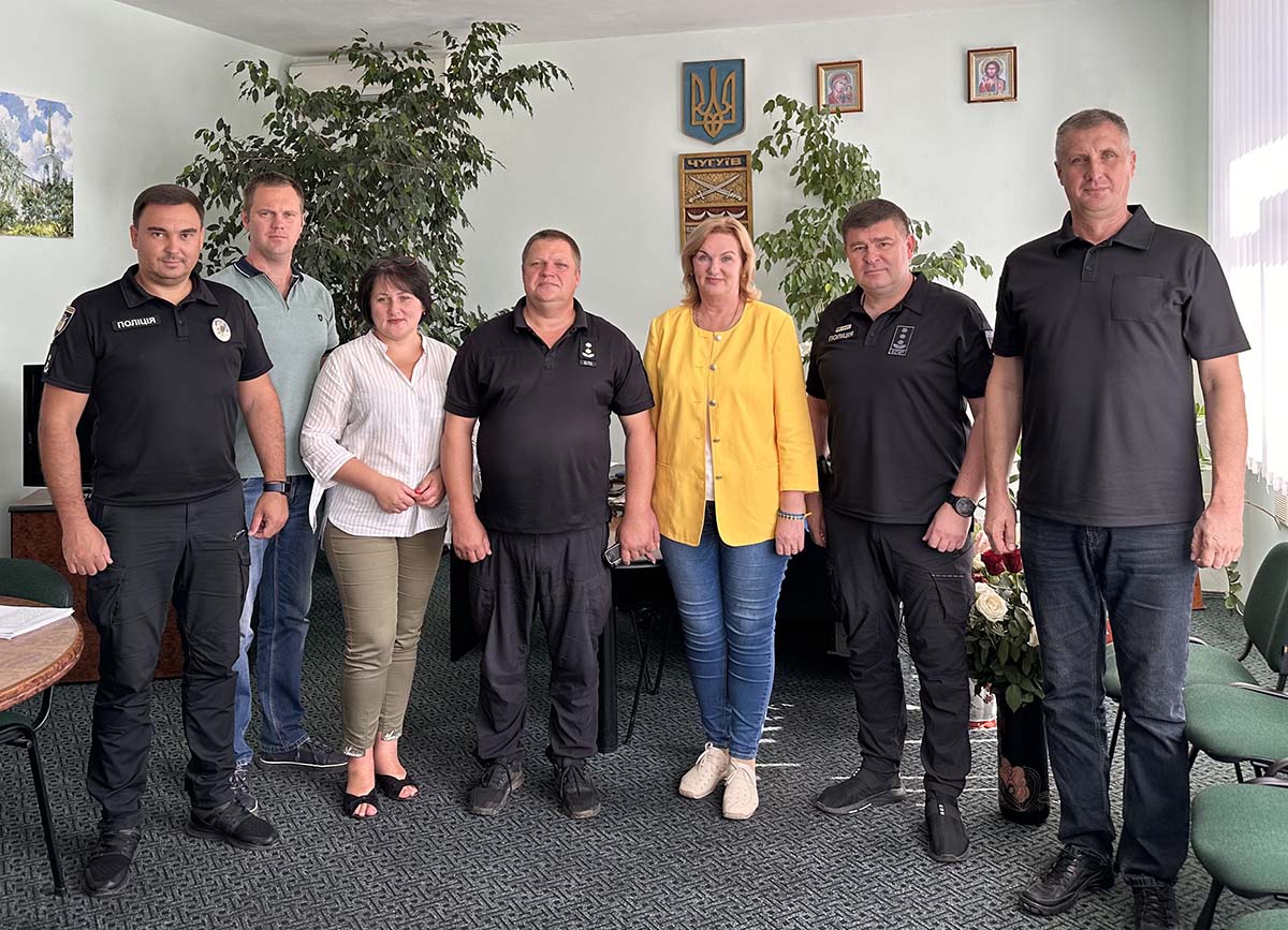 Керівник Управління поліції охорони в Харківській області Юрій Лукавенко та заступник начальника Управління технічної охорони Департаменту поліції охорони Сергій Кіфорук завітали на Чугуївщину, щоб взяти участь у робочій зустрічі з начальником Чугуївської міської військової адміністрації Галиною Мінаєвою.