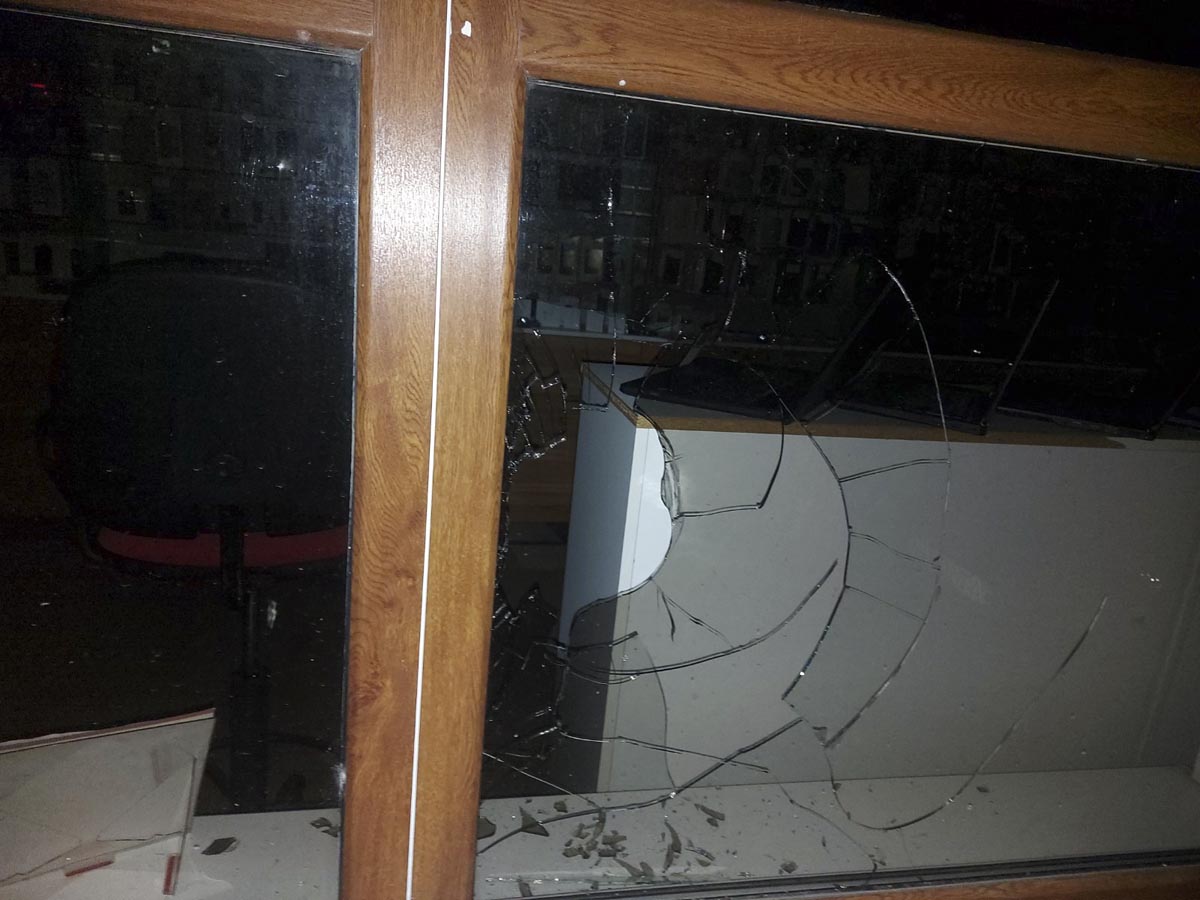 Прибувши за вказаною адресою поліцейські виявили чоловіка, який перебував у стані алкогольного сп’яніння, і перед тим розбив склопакет металопластикових вікон та дверей у двох магазинах та пошкодив банківський термінал, який знаходився при вході у магазин.