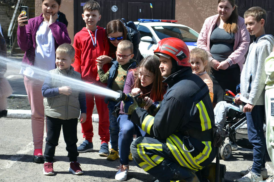 А працівники УДСНС організували для дітей пожежну естафету: кожен охочий навчився збивати струменем води м’яч.
