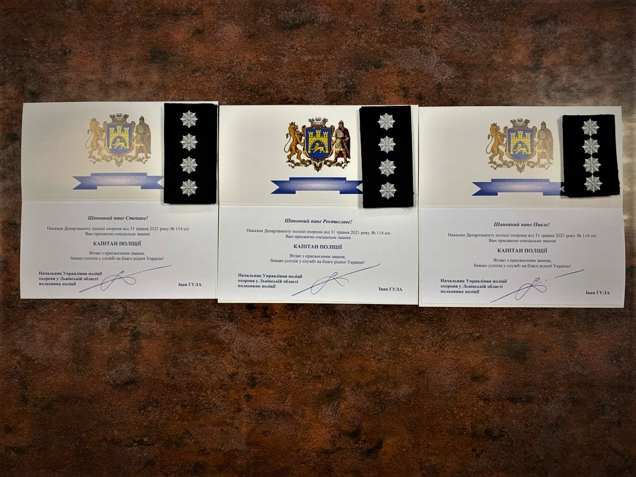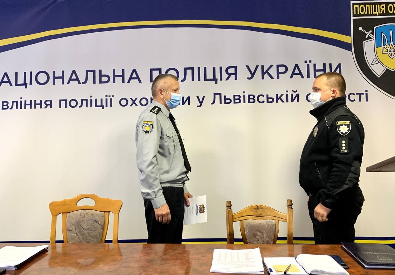 - «капітан поліції» старшому інспектору групи фізичної охорони батальйону №2 полку Управління поліції охорони у Львівській області Крутіню Павлу Сергійовичу.