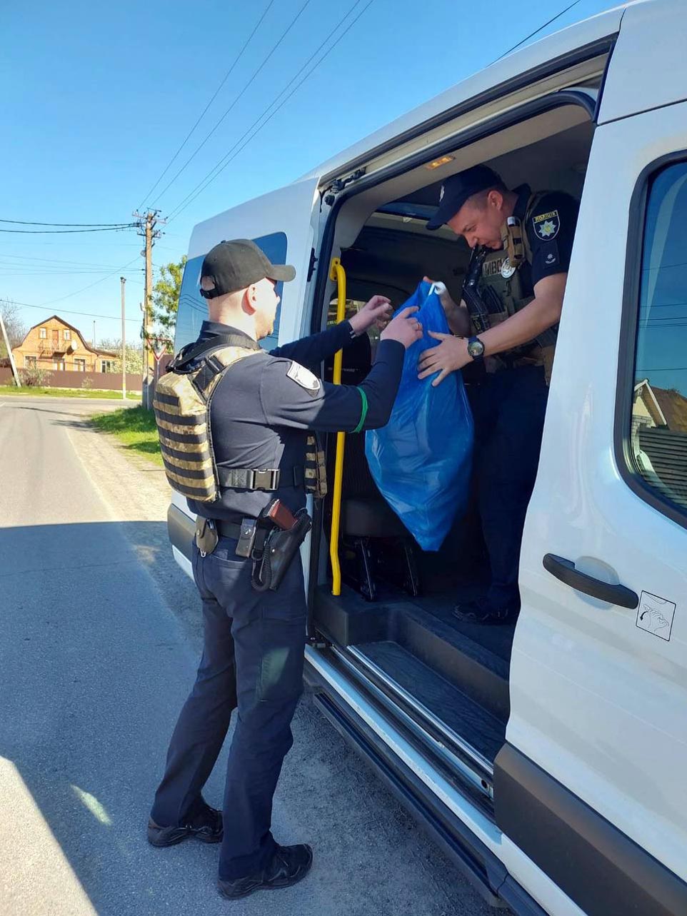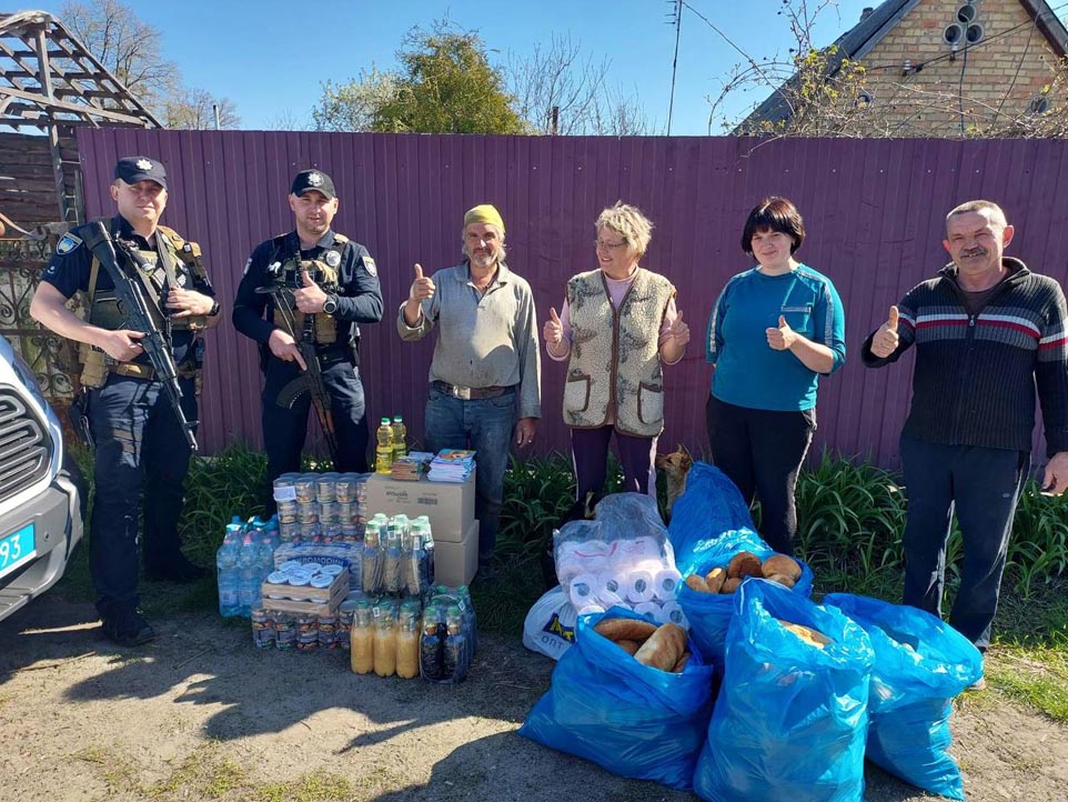 Працівники Управління поліції охорони з фізичної безпеки в місті Києві разом з волонтерами доставляють громадянам гуманітарну допомогу на Київщині: питна вода, хліб, харчові продукти, предмети першої необхідності. Першочергово допомога надається населеним пунктам, які найбільше постраждали від обстрілів російських загарбників.