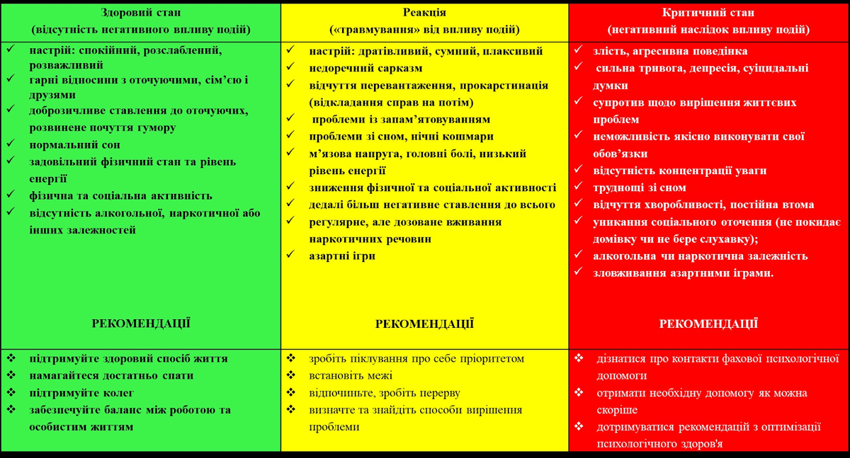 Пропонуємо вашій увазі інформаційний буклет «Світлофор психологічного здоров’я», з яким ми вже знайомилися у рамках заходів психологічної підтримки поліцейських Івано-Франківщини за принципом «Рівний-Рівному». За допомогою цього буклету можна діагностувати свої реакції на стрес та отримати певні рекомендації щодо подальших дій з метою збереження чи відновлення свого психологічного здоров’я.