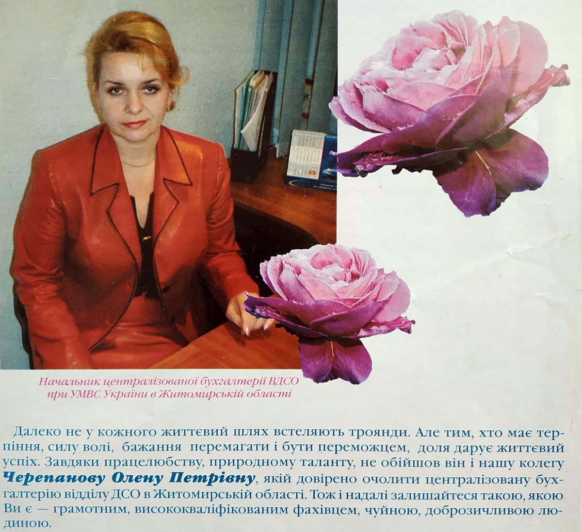 У 2022 році виповнилося рівно 20 років відколи теперішній головний бухгалтер – начальник відділу фінансового забезпечення Управління поліції охорони Житомирщини Олена Петрівна Черепанова прийшла на роботу в службу охорони. 20 років роботи поспіль – такій самовідданості може позаздрити кожен. «Гарний фахівець, чудовий порадник та добра людина», – так колеги відгукуються про Олену Петрівну. Трудовий шлях у службі охорони розпочала у 2002 році. За час роботи для багатьох Олена Петрівна стала другом, гарним порадником, вчителем. Розумна, ввічлива та з великим життєвим досвідом. До неї йдуть за порадою не лише щодо робочих питань, а й часто з особистих. Пані Олена має високі моральні та професійні якості. За це в Управлінні її цінують й поважають.