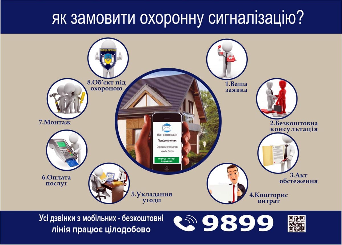 Після виконання монтажних робіт та укладання договору власність замовника гарантовано перебуватиме під надійним захистом поліції охорони. У разі спроби зловмисників потрапити у приміщення, охоронна сигналізація негайно надасть сигнал «Тривога» на цілодобовий пульт охорони. Наряд реагування озброєних поліцейських охорони прибуде за лічені хвилини на місце виклику і завадять злочинцям заволодіти чужим майном. При спрацюванні сигналізації нічого помітного для злодія не відбувається і він навіть не підозрює, що найближчим часом його затримає поліція.