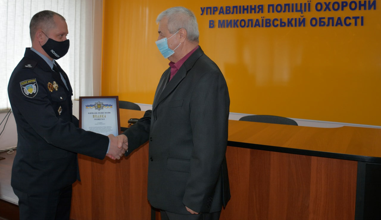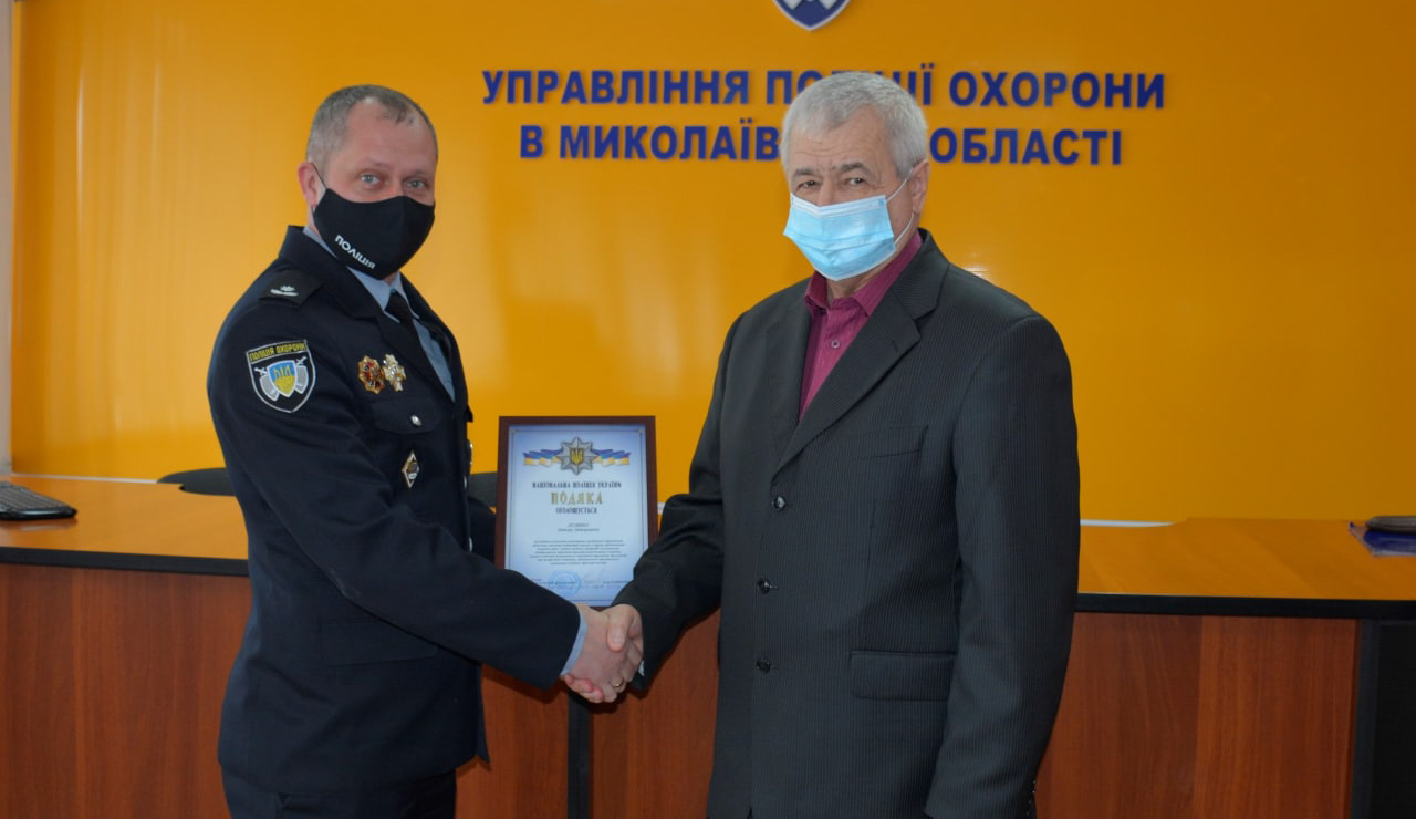 Заступник начальника Управління Сергій Строін особисто вручив Дмитру Дмитровичу похвальну грамоту від голови Національної поліції України Ігоря Клименко, а голова ради ветеранів Управління Микола Степаненко знакову медаль «Врятувати світ».