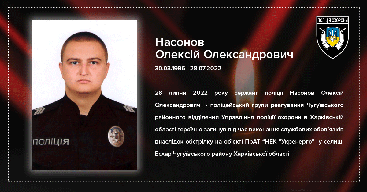 Внаслідок повномасштабного вторгнення рф на територію України поліція охорони зазнала болючих втрат. Цинічна атака російських варварів 28 липня 2022 року забрала життя Олексія Насонова.
