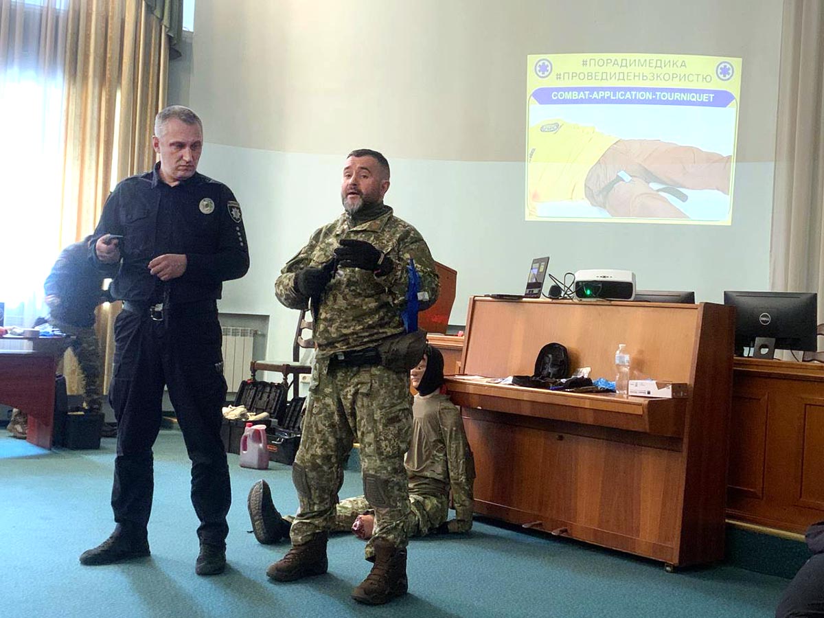 Інструктори розповіли та відпрацювали з особовим складом практичні навички з першої екстреної медичної допомоги під час ведення бойових дій, зокрема: транспортування постраждалого, первинний огляд пораненого, накладання турнікетів, перев’язування ран, зупинка кровотечі, евакуація з червоної зони небезпеки.