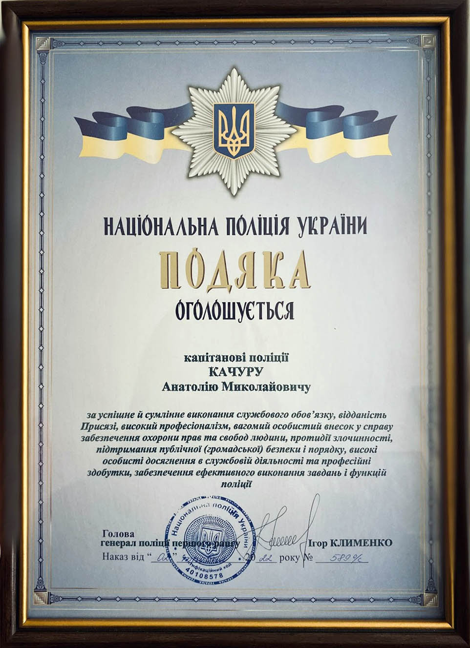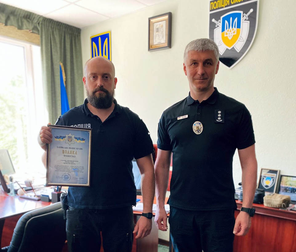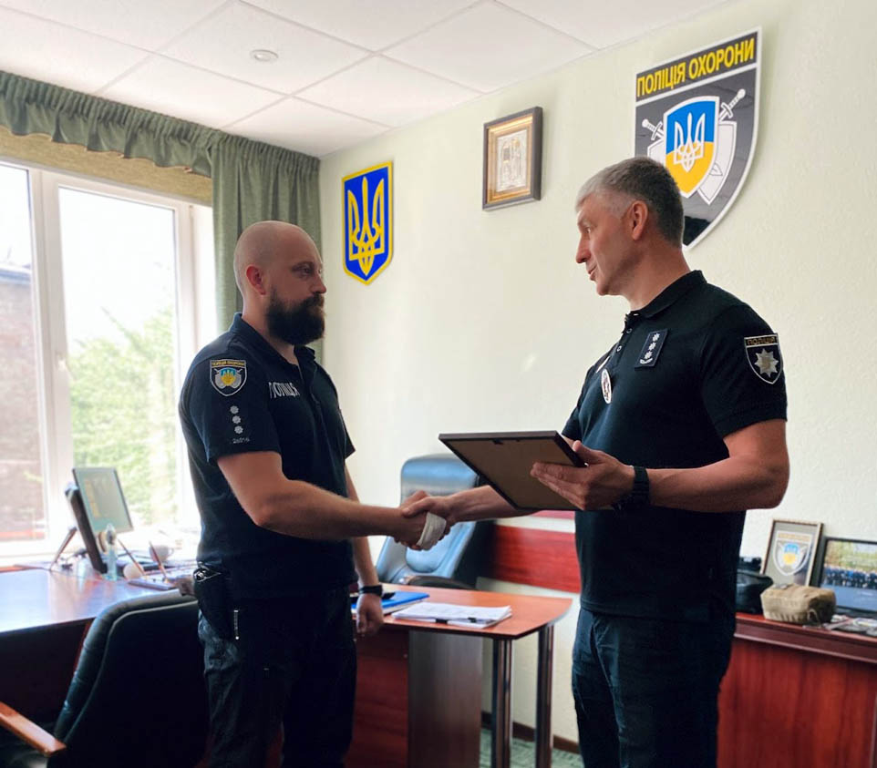 За успішне і сумлінне виконання службового обов’язку, вірність Присязі, високий професіоналізм, вагомий особистий внесок у справу забезпечення охорони прав та свободи людини, протидії злочинності, підтримання публічної безпеки і порядку, високі особисті досягнення в службовій діяльності та професійні здобутки, забезпечення ефективного виконання завдань і функцій поліції поліцейським Управління поліції охорони з фізичної безпеки в м. Києві оголосили подяку від Голови Національної поліції України. Привітав поліцейських начальник Управління поліції охорони з фізичної безпеки в м. Києві полковник поліції Андрій Музика та від імені Голови Національної поліції України вручив подяку капітану поліції Анатолію Качуру, інспектору роти №3 та старшому лейтенанту поліції Віктору Опанасенку, інспектору роти №3 Управління поліції охорони з фізичної безпеки в м. Києві.