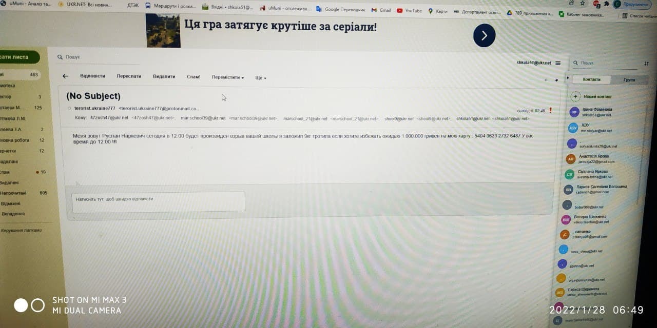 Сьогодні близько шостої години ранку наряд поліції охорони Маріуполя отримав повідомлення про спрацювання тривожної сигналізації в одній з освітніх шкіл міста. Після приїзду на місце виклику поліцейські дізналися, що на електронну пошту директора надійшло повідомлення про замінування будівлі навчального закладу. Автор електронних листів із загрозою підірвати школи о 12 годині дня, представився Русланом Наркевичем і зажадав переказу мільйону гривень на свою банківську карту.