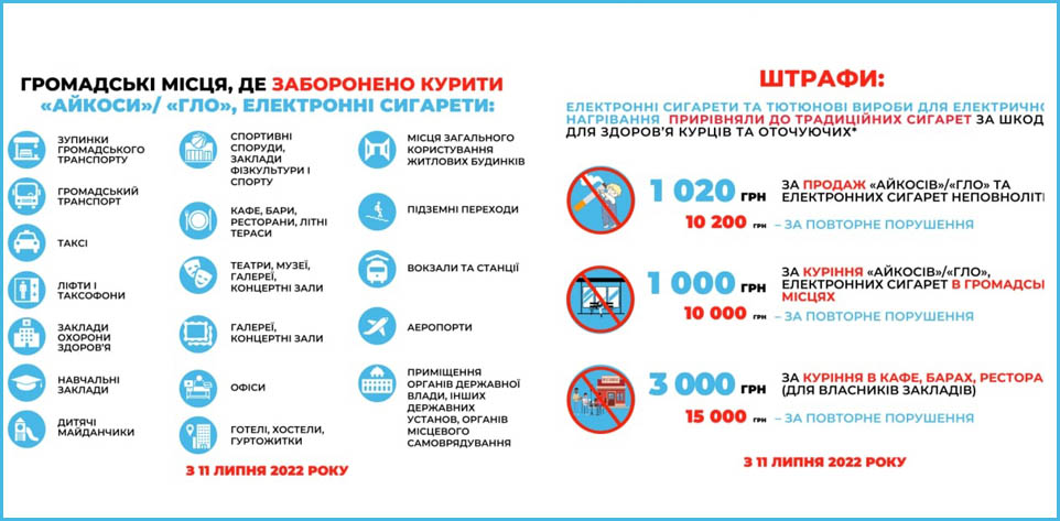 В Україні з 11 липня набувають чинності норми закону №1978, якими забороняється паління електронних сигарет, пристроїв для споживання тютюнових виробів без їх згоряння (IQOS і glo), та кальянів у громадських місцях, а також надається право місцевим органам влади визначати місця, вільні від куріння.