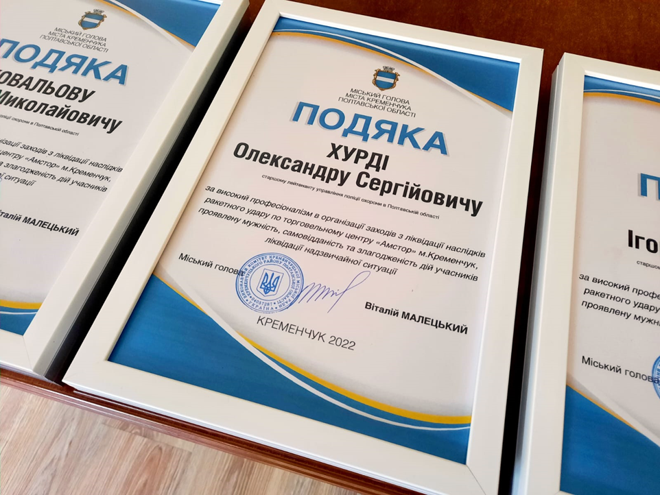 Поліцейських охорони міста Кременчука відзначили подяками міського голови за допомогу під час ліквідації наслідків ракетного удару по торговельному центру «Амстор».