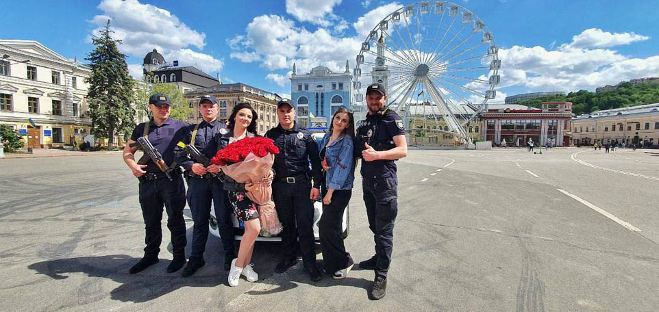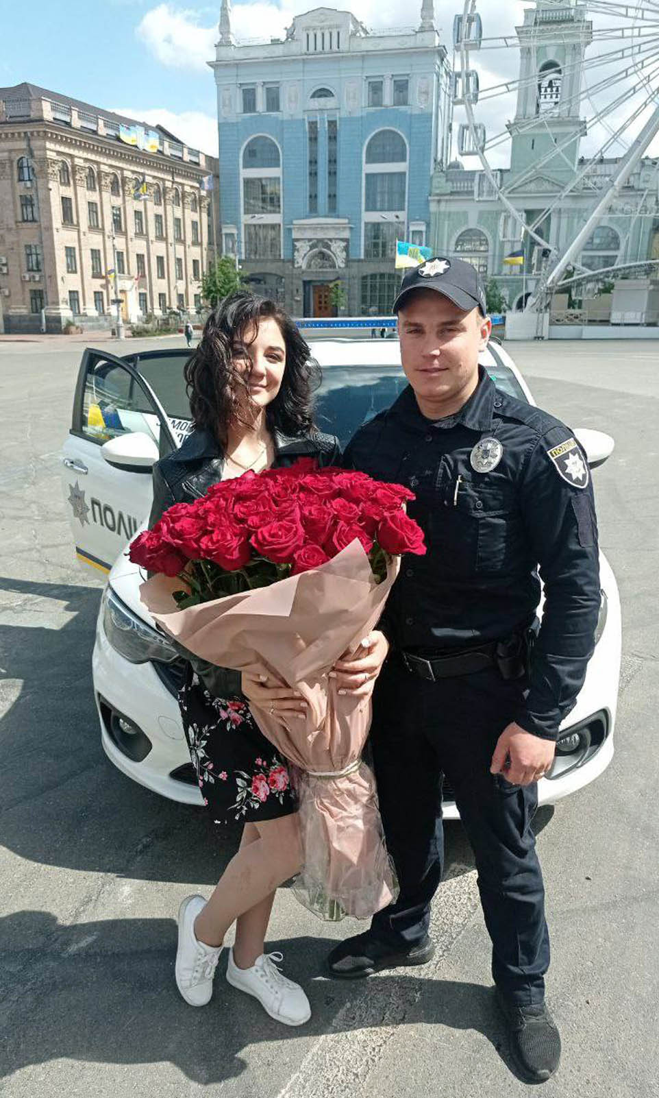 Поліцейський роти реагування Шевченківського районного відділу поліції охорони Ярослав Зозуля запросив свою кохану Катерину на променад містом у слушний момент попросив її закрити очі, тим часом на площу під’їхали колеги на службових автомобілях і почали аплодувати. Майбутній наречений швиденько опустившись на праве коліно простягнув заздалегідь куплену каблучку та з хвилюванням освідчився у своїх почуттях та намірах створити майбутню сім’ю. На пропозицію отримав стверджувальне щасливе «Так».