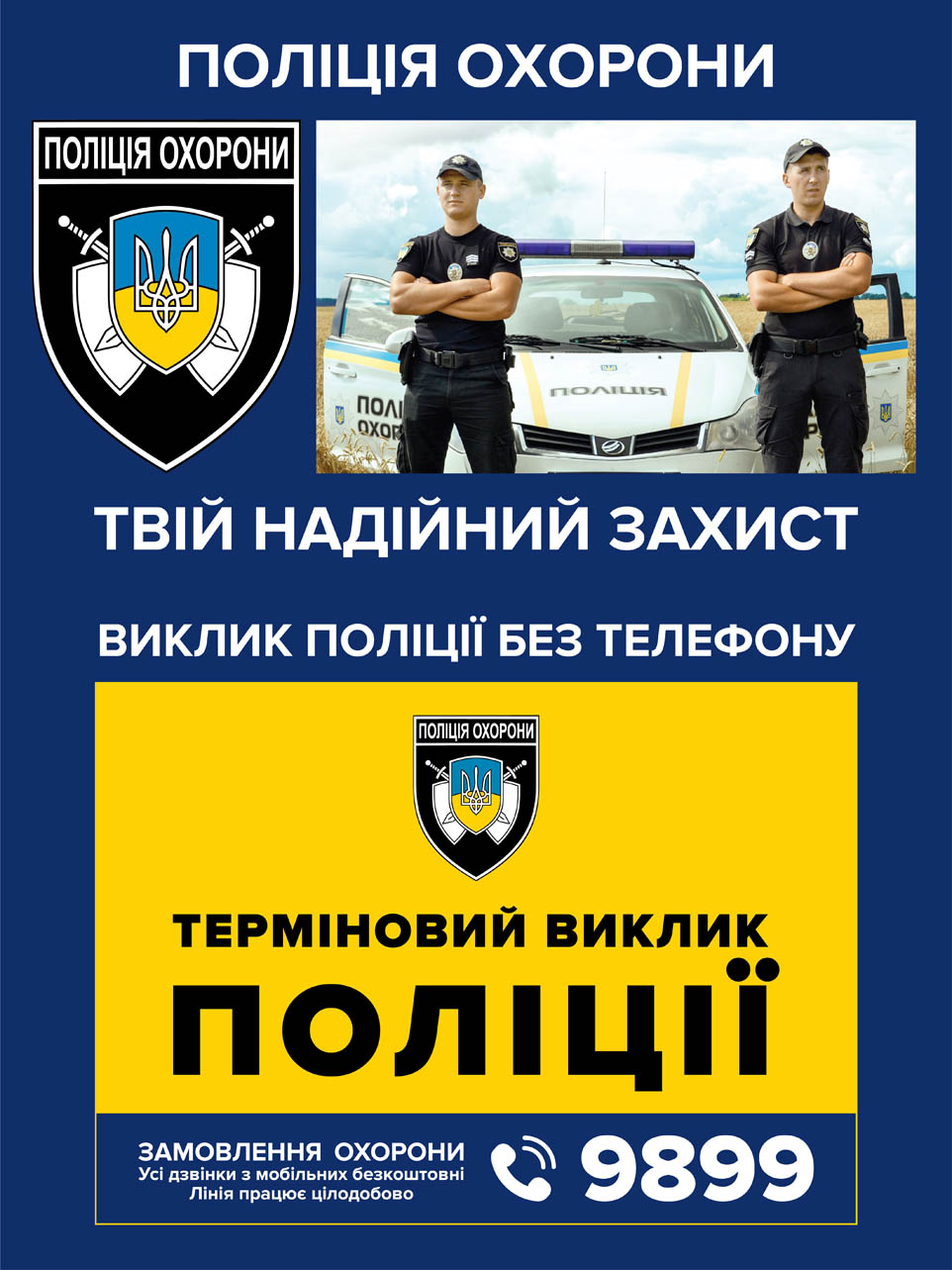 Прогулюючись містом, ви, мабуть, помічали на вітринах магазинів наліпки жовтого кольору «Терміновий виклик поліції». Цей напис свідчить про те, що у разі виникнення непередбачуваної ситуації, випадків загрози життю і здоров’ю громадян чи спроб викрадення чужого майна, у цьому місці можна викликати наряд поліції охорони. Завдяки мобільній роботі наряду реагування, допомога прибуває протягом декількох хвилин, а це важливий фактор під час виявлення злочинців по «гарячих слідах».