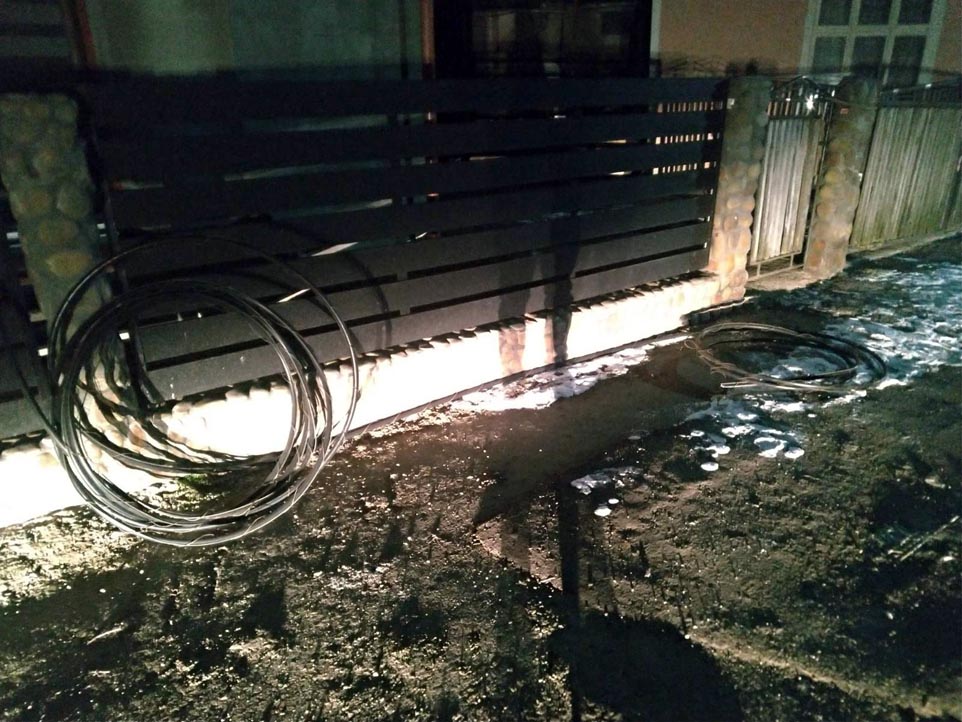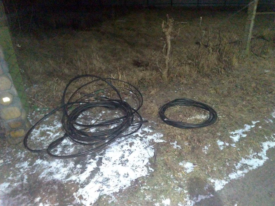 Прибувши за адресою правоохоронці побачили автомобіль, який негайно заблокували. А також, при обстеженні прилеглої території було виявлено двох невідомих осіб, які побачивши працівників поліції намагалися втекти, але були затримані. Під час огляду в них виявили знаряддя вчинення злочину та вирізані близько 100 метрів кабелю.