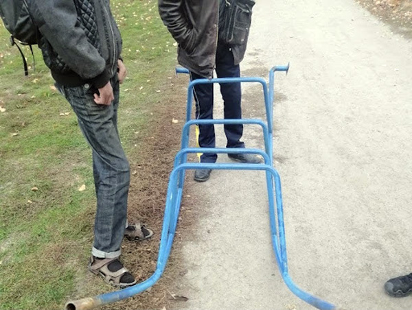 Під час здійснення патрулювання, працівники наряду реагування поліції охорони побачили двох чоловіків, які несли металеву конструкцію з дитячого майданчику.