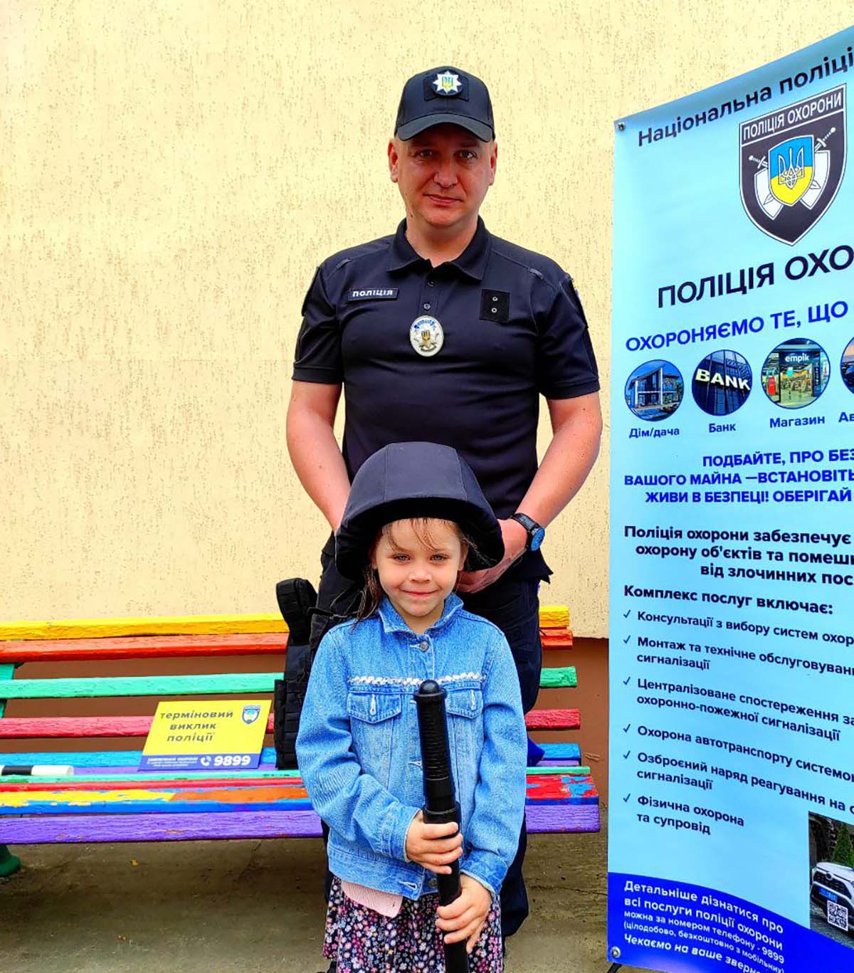 Після показового уроку малеча з радістю примірювала екіпірування. Діти з захопленням розглядали службовий автомобіль, сиділи за кермом, вмикали сирену та проблискові маячки На згадку про зустріч правоохоронці подарували маленькі подарунки та зробили спільне фото. Завдяки проєкту Департаменту поліції охорони «Створюємо простір вашої безпеки» ви можете створити безпечний простір вашої дитини.