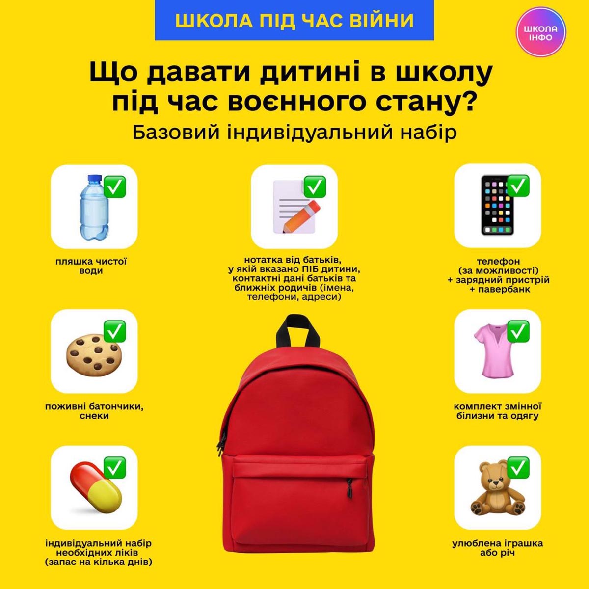 Безпека наших дітей і створення максимально комфортних умов понад усе, тому щодня необхідно говорити з підростаючим поколінням на важливі теми. Проговорюємо з дітьми варіанти поведінки під час оголошення повітряної тривоги, вчимо самостійно одягатись і брати необхідні речі (особливо першачкам), складаємо в тривожну валізу все, що знадобиться у разі перебування малечі в укритті. Якщо дитина в школі, то під час можливої евакуації чи спуску до укриття, вона братиме з собою наплічник, в який ви покладете: