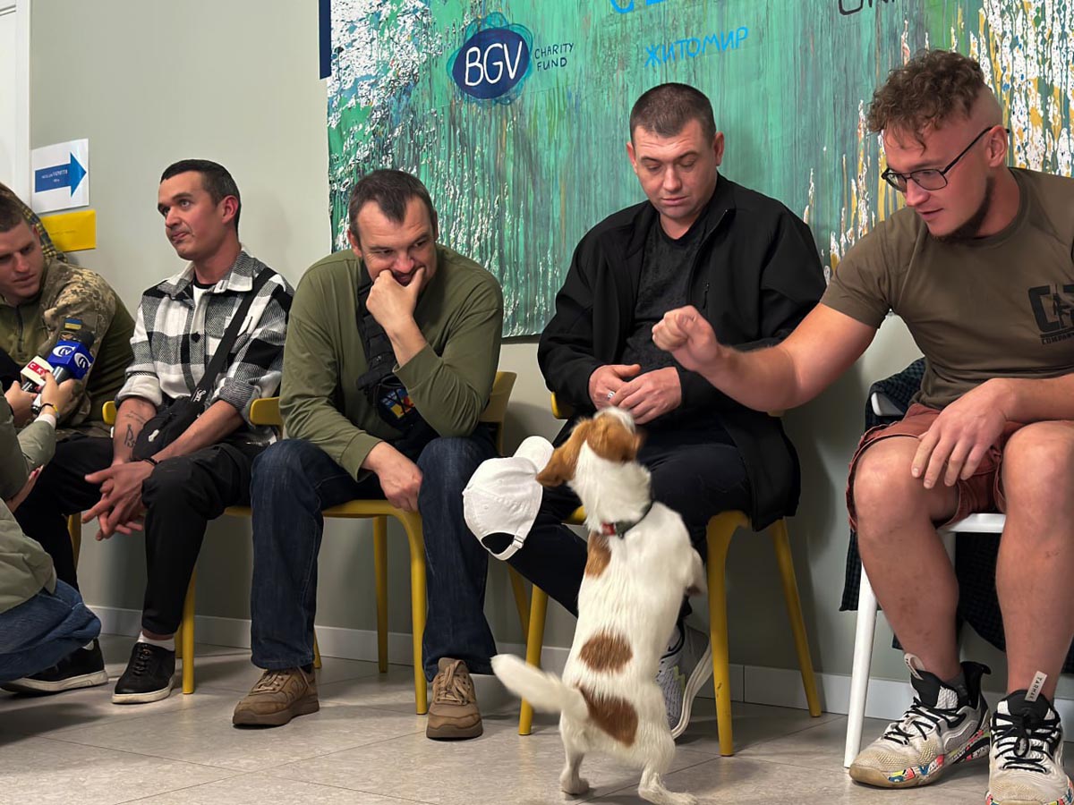 Під час заняття учасники виконували вправи зі спеціально підготовленими собаками під керівництвом кінологині Житомирської Академії поліції Катерини Стрілець. Допомагала у роботі також психологиня Центру життєстійкості Катерина. Програма включала рухливі ігри з м’ячем, відпрацювання команд та вправу на довіру — пройти між стільцями із заплющеними очима, тримаючи собаку на повідку. Такі взаємодії сприяють зниженню рівня стресу, покращують емоційний стан і створюють атмосферу довіри та взаємної підтримки.